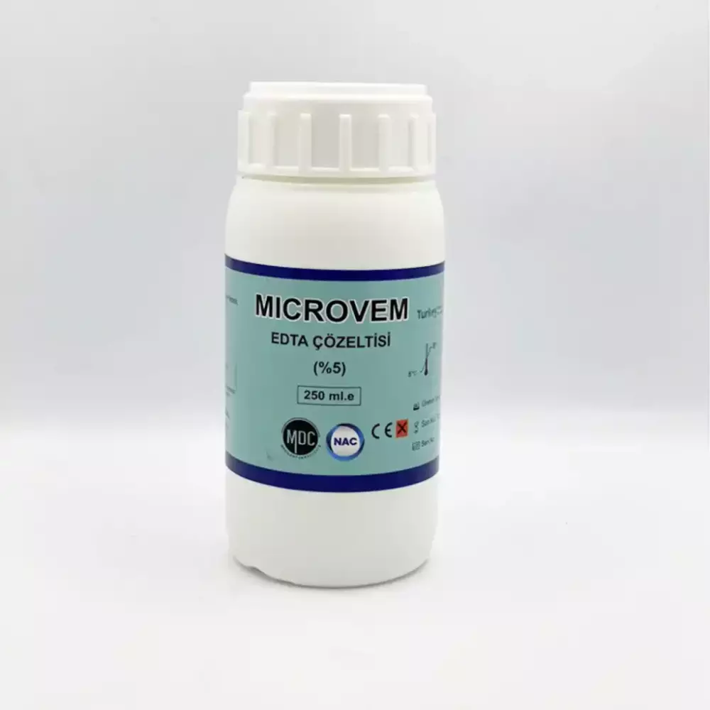 Altun Microvem EDTA Çözeltisi %5, kök kanal tedavilerinde kanalın yıkanması ve hazırlanması için kullanılan yüksek kaliteli bir solüsyondur. En az %5 EDTA içeriği ile dentin yüzeyindeki smear tabakasını etkili bir şekilde uzaklaştırarak, kanal duvarlarının mekanik temizliğine destek sağlar.