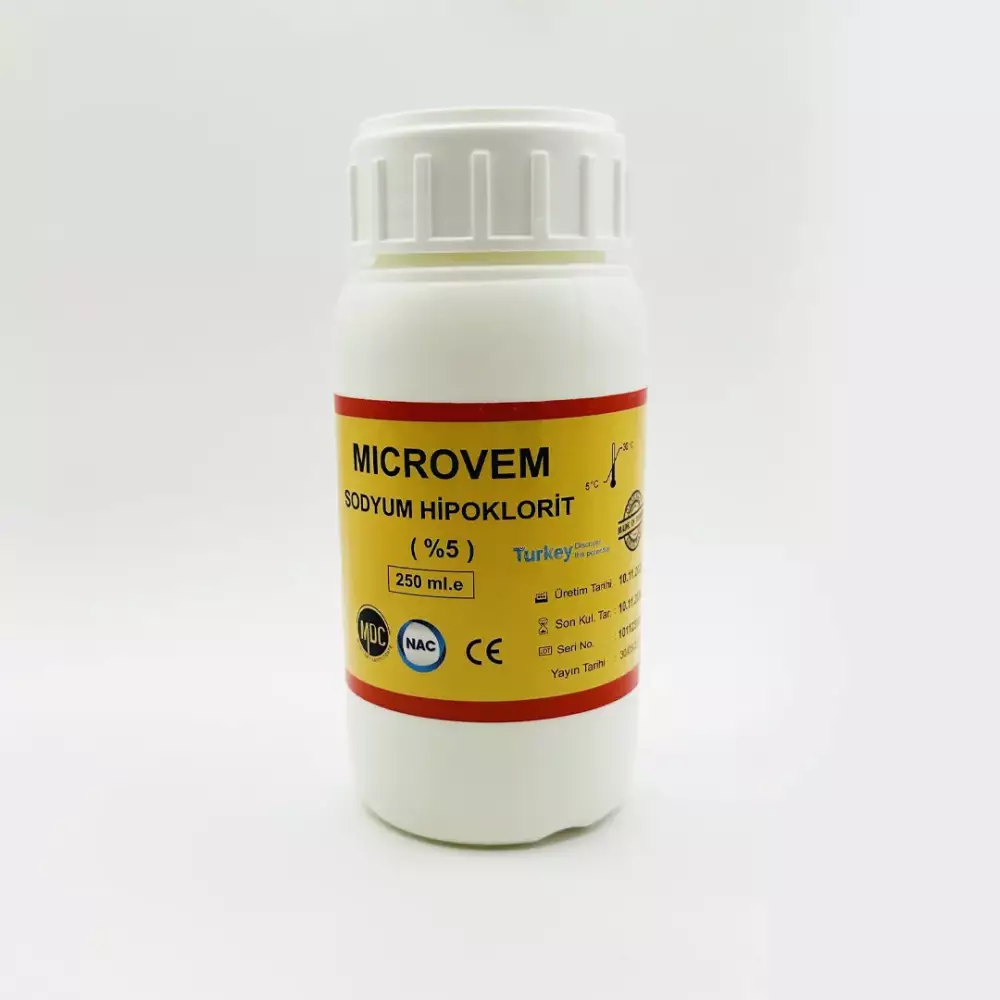 Altun Microvem Sodyum Hipoklorit %5, diş hekimliğinde kök kanal tedavileri sırasında kanalın yıkanması ve dezenfeksiyonu için kullanılan etkili bir solüsyondur. Distile su ile hazırlanmış olup, en az %5 sodyum hipoklorit içeriğiyle yüksek dezenfektan etkisi sunar.
