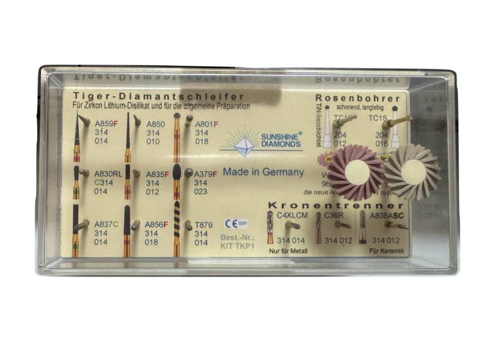 Sunshine Diamonds Zirkonyum Genel Hazırlık Seti, zirkonyum restorasyonların hazırlanması sırasında kullanılan yüksek kaliteli elmas frezlerden oluşan bir settir. Bu set, zirkonyum materyallerin kesimi, şekillendirilmesi ve yüzey düzleştirilmesi işlemlerinde etkin performans sağlar.